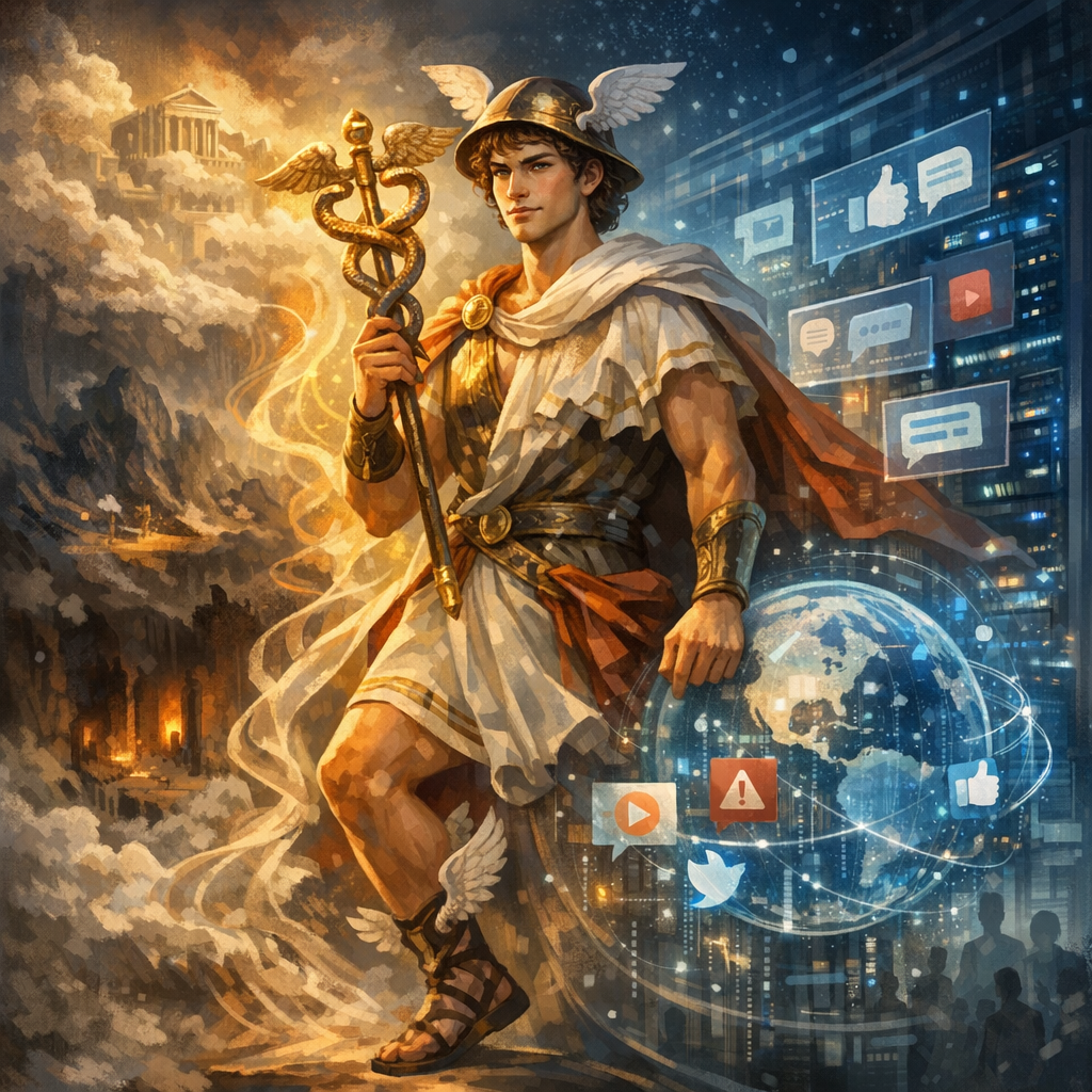 L’information antique voyageait par la parole d’Hermès, limitée par la vitesse humaine et la mémoire orale. L’hyper-changement numérique accélère cette circulation de manière exponentielle avec des milliards de publications quotidiennes. Les fausses informations virales exploitent cette vitesse, car une rumeur se propage six fois plus rapidement qu’un fait vérifié sur les plateformes comme X (anciennement Twitter), selon l’étude fondatrice de Vosoughi, Roy et Aral publiée dans Science en 2018. Ce phénomène polarise les opinions et érode la confiance collective. Hermès le rusé préfigure cette ambiguïté fondamentale : il est à la fois protecteur et trompeur, médium qui révèle et qui déforme, anticipant l’ambivalence des technologies contemporaines.