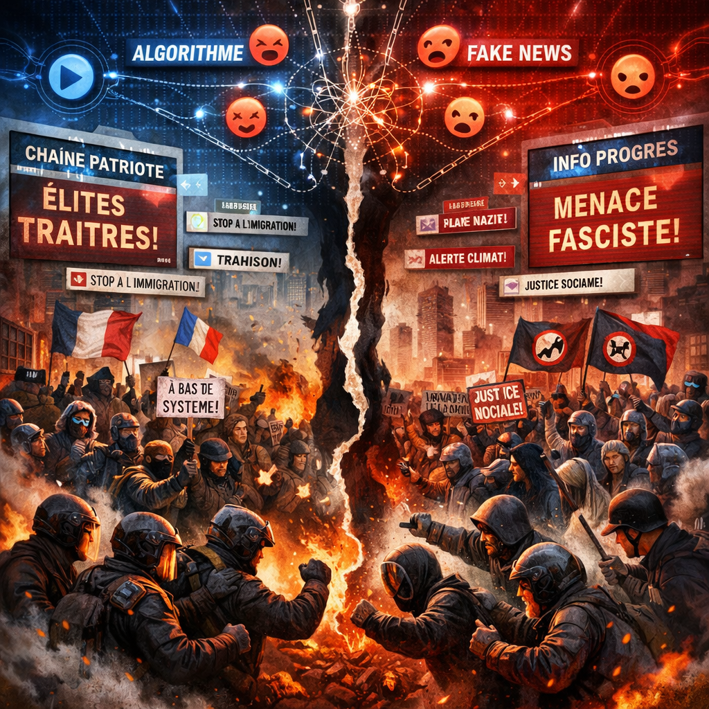 La radicalisation s’accélère à cause des boucles de rétroaction algorithmique. Les plateformes récompensent l’indignation par plus de visibilité, poussant les discours vers l’extrémisme par sélection évolutionnaire. En France, la confiance envers les médias traditionnels n’est que de 37% (Edelman 2026), ce qui pousse les citoyens vers des sources partisanes alternatives. Les modérés s’isolent par fatigue cognitive et les extrêmes s’arment de récits de victimisation morale. Cette logique empêche le débat démocratique. Les mouvements sociaux récents (Gilets Jaunes, réforme des retraites) illustrent comment une tension initiale peut dégénérer en violence lorsque l’État ne parvient plus à proposer un récit commun.