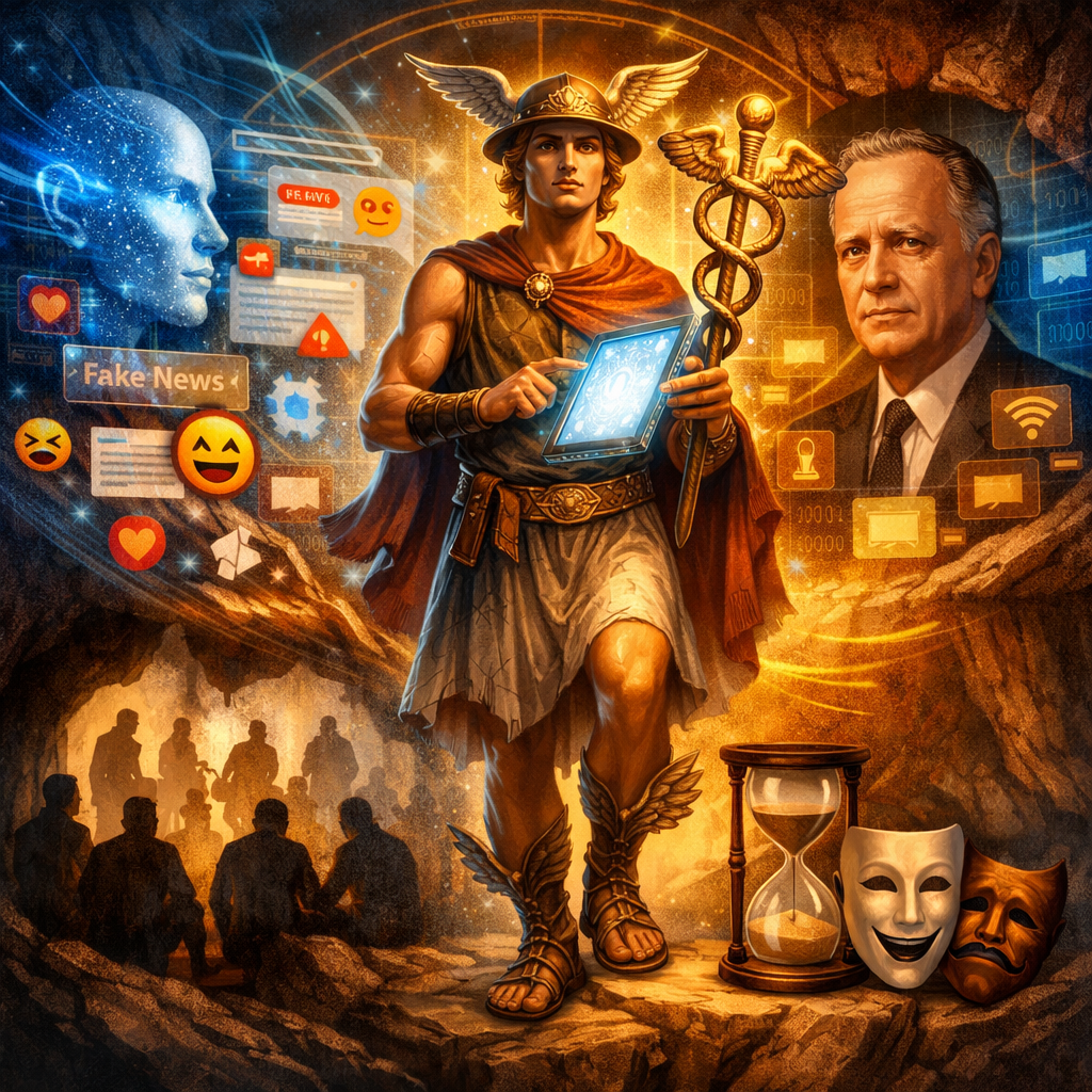 En définitive, Hermès et McLuhan convergent vers une même vérité anthropologique : nous ne communiquons jamais avec des faits bruts, toujours avec des réalités médiatisées et transformées par le canal. La question éthique n’est pas d’éliminer cette transformation – impossible – mais de la rendre consciente par éducation critique, transparence algorithmique et hygiène informationnelle collective. Sans cette lucidité, nous restons des prisonniers de la caverne inversée, croyant voir le réel alors que nous ne voyons que les ombres forgées par nos propres outils.