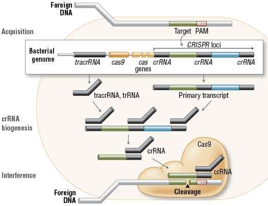 Celui-ci est maturé en un ensemble de courts fragments d’ARN appelés crRNAs (« CRISPR RNAs ») : chacun d’entre eux contient une séquence unique complémentaire d’un fragment d’ADN invasif.