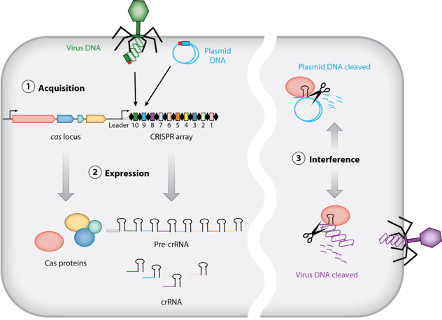 CRISPR est le mécanisme de défense naturel des procaryotes. Les procaryotes font face à l’assaut constant des envahisseurs génétiques que sont les virus. Ceux-ci sont dix fois plus nombreux que les procaryotes et tuent la moitié des bactéries présentes sur Terre tous les deux jours. Les procaryotes ont dû en conséquence développer un ensemble d’armes défensives pour faire face à la menace des virus. Chaque enzyme est programmée pour reconnaître certaines séquences, et un microbe est protégé seulement s’il a une copie du gène de l’agresseur. CRISPR s’adapte et se souvient des envahisseurs génétiques spécifiques d’une manière similaire à la façon dont les anticorps humains fournissent une immunité à long terme après une infection. C’est en étudiant les séquences entre les répétitions palindromiques qui semblaient correspondre à des génomes viraux, que les chercheurs en ont déduit la fonction de CRISPR. Certaines protéines associées au CRISPR ajoutent des séquences d’espacement au génome après que les bactéries et les archées ont été exposées à des virus ou plasmides spécifiques. Avec la ou les protéines associées, le système coupe et stocke l’ADN des envahisseurs. L’ARN fabriqué à partir de ces « espaceurs » dirige d’autres protéines pour absorber tout ADN ou ARN envahissant qui correspond à la séquence. Cela permet à l’organisme de conserver une mémoire génétique de cet envahisseur, qu’il peut alors référencer pour l’identifier rapidement s’il le retrouve à l’avenir.