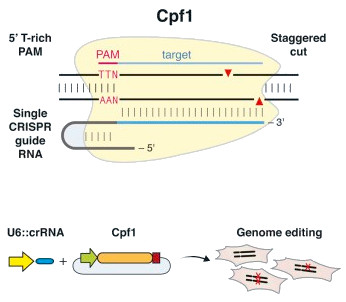De plus, le système CRISPR/Cpf1 est une endonucléase plus petite et plus simple d’emploi que Cas9, permettant de dépasser certaines des limitations de CRISPR/Cas9 : elle ne nécessite aucune molécule supplémentaire pour transformer le pre-crRNA en CRISPR RNA (crRNA).
