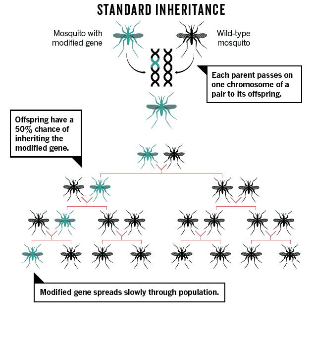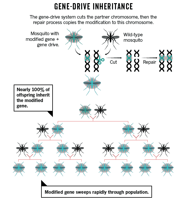 Ces modifications génétiques peuvent donc se répandre rapidement eu sein des populations, et peuvent devenir incontrôlables, car cette transmission se fait indépendamment des conséquences qu’elles peuvent avoir. Autrement dit, les « gene drives » sont transmis même s’ils ont des effets négatifs sur les espèces concernées. Des « gene drives » de synthèse ont été développés pour la première fois, dans le cadre des recherches en biologie génétique, afin d’être utilisés dans la lutte contre la reproduction des moustiques transmetteurs de la malaria. L’objectif était d’obtenir des populations de moustiques dépourvues des gènes transmetteurs de la malaria afin que celles-ci supplantent les populations originelles. Jusqu’ici, les espèces dites transgéniques, au génome modifié de manière traditionnelle, ne se répandent pas facilement dans la nature, car seulement 50 % de leurs descendants conservent les caractères introduits par manipulation génétique. Avec l’utilisation de « gene drives », ces caractéristiques sont maintenues dans 100 % des descendants. Or, utilisés au sein d’espèces mobiles, tels les moustiques ou les mouches du fruit, ces génomes modifiés pourront s’étendre à d’autres espèces, sans qu’il soit possible de prévoir ou prévenir leur dispersion. Donc cette pratique, si elle se développait, ne serait pas sans danger. Outre dans le domaine des moustiques, de nombreux chercheurs développent des « gene drives » synthétiques en vue de les diffuser au sein de diverses populations d’espèces sauvages afin d’altérer leurs capacités à transmettre des maladies, et plus simplement à empêcher la reproduction des espèces considérées – à tort ou à raison – comme nuisibles.