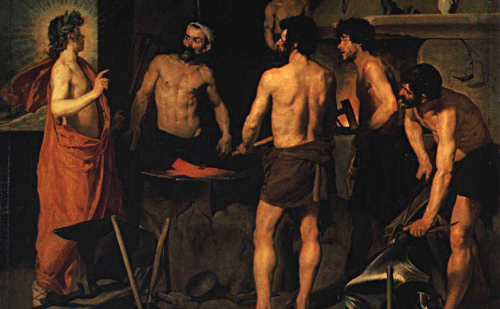 Mais Héphaïstos n’est pas qu’un artisan de talent. Ingénieux, il fabrique des armes remarquables et il est connu pour cela. Mais il fabrique aussi des chaises roulantes qui se déplacent toutes seules, des servantes en or qui l’aident à se déplacer, et à la demande de Zeus, il va jusqu’à façonner Pandore, une statue d’argile à laquelle Athéna prêtera vie. Cette dernière était venue trouver Héphaïstos pour qu’il lui confectionne des armes. Le dieu, abandonné par Aphrodite, se laissa aller à désirer Athéna, et il se lança à sa poursuite quand elle prit la fuite. Quand il eut réussi à se rapprocher d’elle, à grand peine, puisqu’il était boiteux, il chercha à l’étreindre. Mais elle, la chaste vierge, ne se laissa pas faire, si bien qu’il éjacula sur la jambe de la déesse. Dégoûtée, elle essuya le sperme avec un flocon de laine, qu’elle jeta par terre et s’enfuit… Si Héphaïstos est le dieu du faire, Athéna, qui apparaît ici comme celle qui passe commande, est la déesse du savoir.